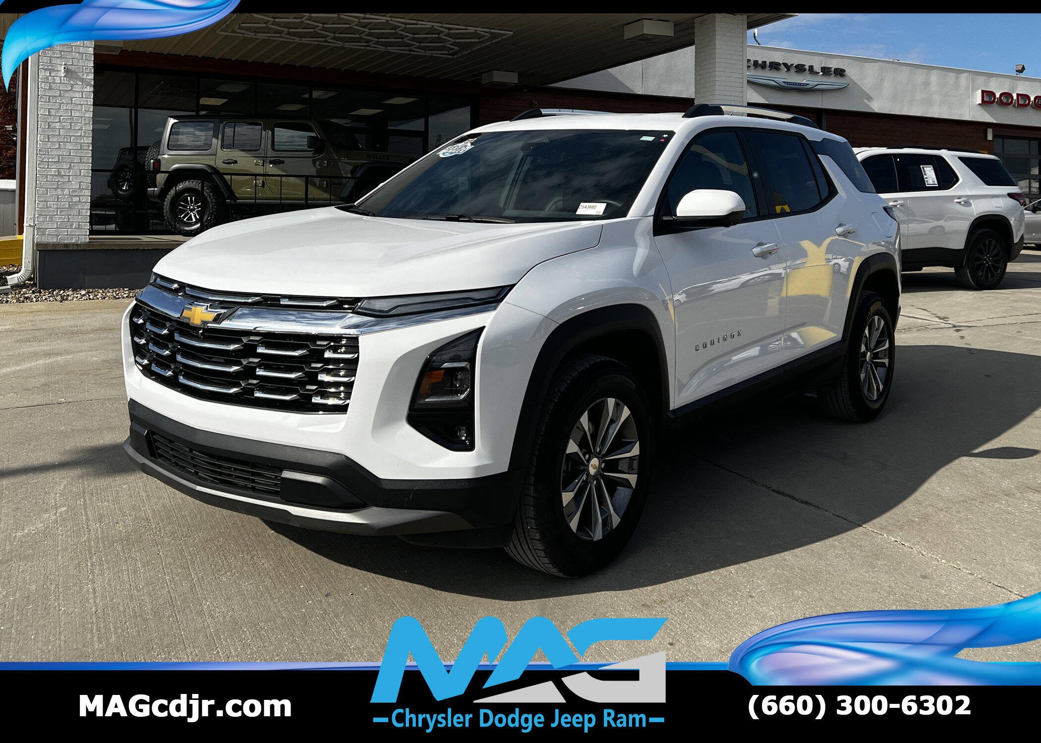 WIRELESS CHARGING FOR DEVICES, WIPERS, FRONT RAIN-SENSING, INTERMITTENT, UNIVERSAL HOME REMOTE NON-FUNCTIONAL see dealer for details., UNIVERSAL HOME REMOTE includes garage door opener, programmable, TRAFFIC SIGN RECOGNITION, SUNGLASS STORAGE, OVERHEAD, SUMMIT WHITE, SENSOR, CABIN HUMIDITY AND WINDSHIELD TEMPERATURE, SEAT ADJUSTER, DRIVER 8-WAY POWER, SEAT ADJUSTER, 2-WAY POWER DRIVER LUMBAR CONTROL. This Chevrolet Equinox has a powerful Turbocharged Gas I4 1.5L/ engine powering this Automatic transmission.*Experience a Fully-Loaded Chevrolet Equinox AWD LT *SAFETY AND TECHNOLOGY PACKAGE includes (DRZ) Rear Camera Mirror, (T3U) front fog lamps, (UKK) Rear Pedestrian Alert, (UV2) HD Surround Vision and (UVX) Traffic Sign Recognition., CONVENIENCE PACKAGE II Includes (A2X) 8-way power driver seat adjuster, (AL9) 2-way power driver seat adjuster, (ASV) cabin humidity and windshield sensor, (CE1) Rainsense intermittent front wipers, (CJ2) dual-zone automatic climate control, (CMO) Heated Wiper Park, (K4C) Wireless Charging, (TCP) AutoSense, hands-free power programmable liftgate, (UG1) Universal Home Remote, (VK8) sunglass holder and (V2P) roof rails (Also includes Evotex seating in (H9F) Black or (ENY) Artemis Gray. , ROOF RAILS, REAR PEDESTRIAN ALERT, REAR CAMERA MIRROR WASHER, REAR CAMERA MIRROR, LT PREFERRED EQUIPMENT GROUP includes standard equipment, LIFTGATE, AUTOSENSE, HANDS-FREE POWER PROGRAMMABLE, HEATED WIPER PARK, HD SURROUND VISION, FOG LAMPS, FRONT, BLACK, EVOTEX SEAT TRIM, AXLE, 3.47 FINAL DRIVE RATIO, AIR CONDITIONING, DUAL-ZONE AUTOMATIC CLIMATE CONTROL with individual climate settings for driver and right-front passenger, Wireless Apple CarPlay/Wireless Android Auto, Windows, remote express-up/-down driver and express-down all passengers, Window, rear side, solar absorbing, privacy tinting, Wi-Fi Hotspot capable (Terms and limitations apply. See onstar.com or dealer for details.), Wheels, 17 (43.2 cm) Grazen Metallic machined-face aluminum, Visors, driver and front passenger illuminated vanity mirrors, covered.*Stop By Today *A short visit to MAG Chrysler Dodge Jeep Ram located at 310 S Washington St, Chillicothe, MO 64601 can get you a trustworthy Equinox today!